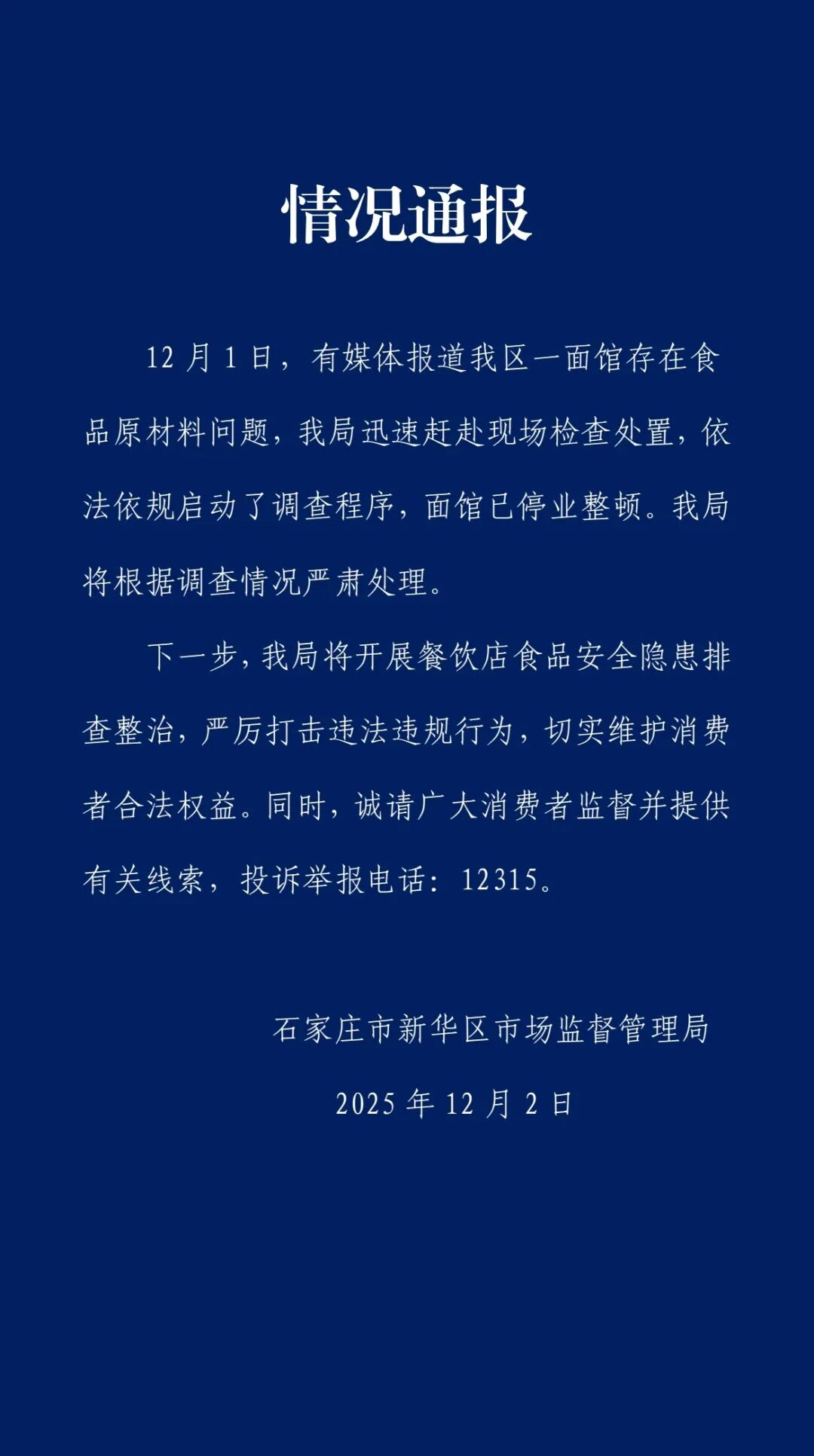 下一步,切实消费者权益。该局将按照查询拜访环境庄重处置。峻厉冲击违法违规行为,该局将开展餐饮店食物平安现患排查整治,市新华区市场监视办理局发布环境传递。该局敏捷赶赴现场查抄措置!12月1日,有报道新华区一面馆存正在食物原材料问题,同时,依法依规启动了查询拜访法式,诚请泛博消费者监视并供给相关线。