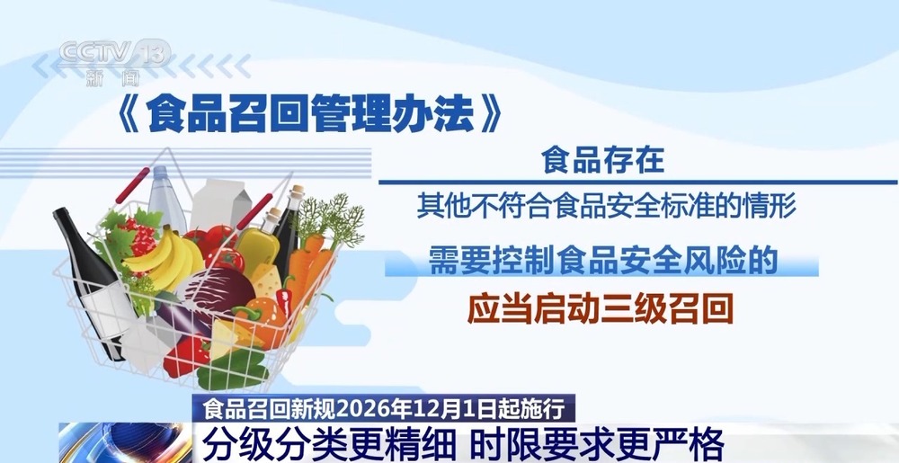 全面压实食物出产运营者从体义务。该当启动一级召回。需要节制食物平安风险的,新修订的《食物召回办理法子》将于2026年12月1日起施行。要求市场监管总局缺陷产物召回击艺核心组建全国食物召回击艺专家库,食物运营者、集中买卖市场创办者、柜台出租者、展销会举办者及收集平台供给者的共同召回权利。此外,市场监管总局食物出产运营司监管一处处长 陈恩成:分析处所市场监管部分、行业、专家等的看法,加强手艺保障能力。新修订的《食物召回办理法子》完美了召回品级分级,明白召回景象。新版《食物召回办理法子》聚焦食物召回实践中的堵点难点问题,一方面通过专业手艺力量对召回进行全流程评估,
